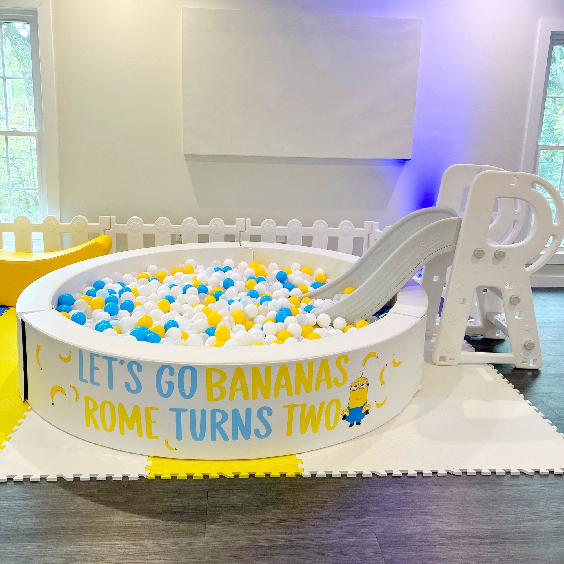 Our 7ft round ball pit rents for up to four hours. Additional hours can be purchased for $50. Slide and custom vinyl decals can be added for an additional fee.