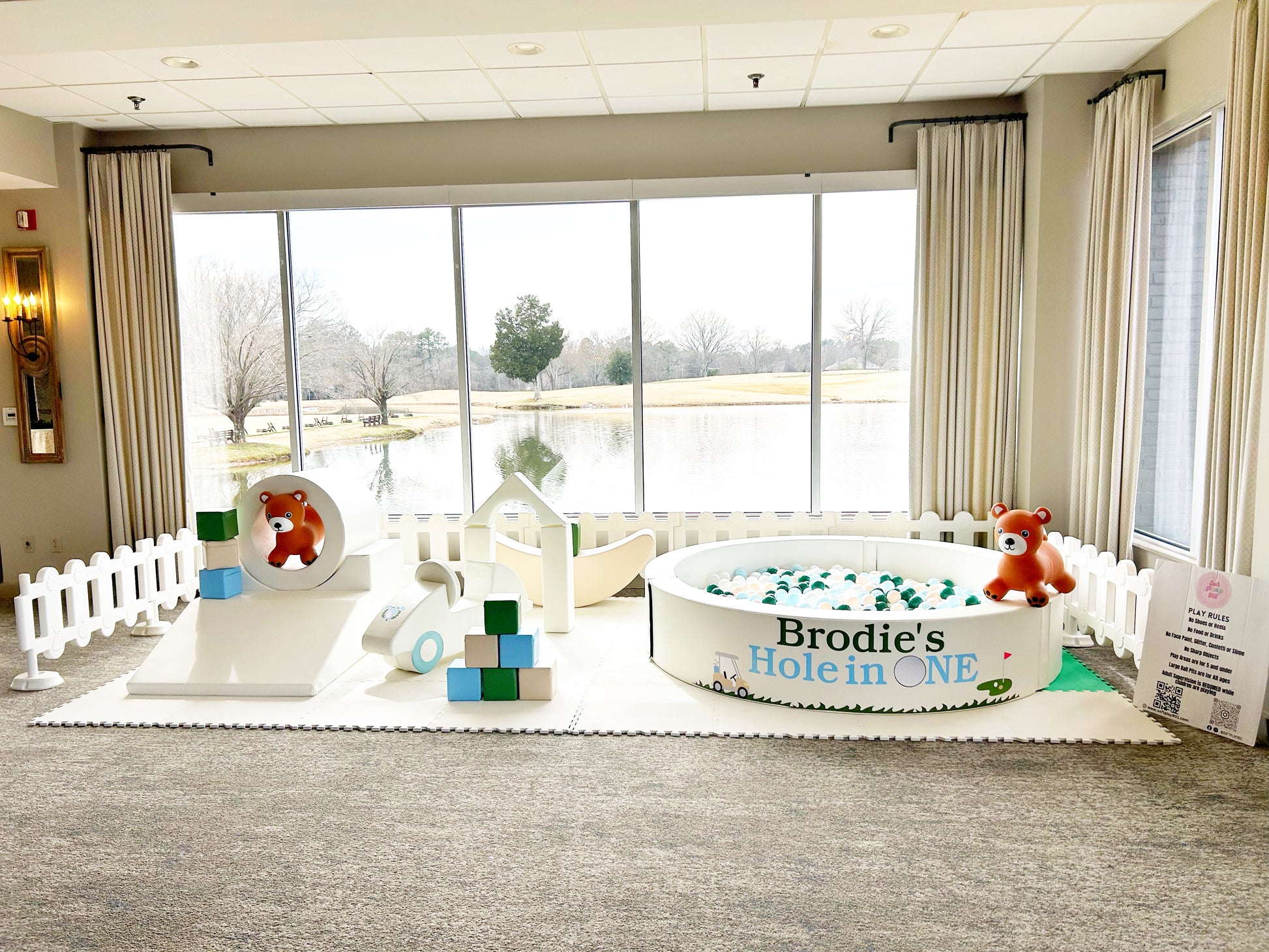 White fences, foam floor mats, large white 7ft round ball pit, climb and slide tunnel, large cube blocks, jumbo house blocks, 2 bouncy hoppers and