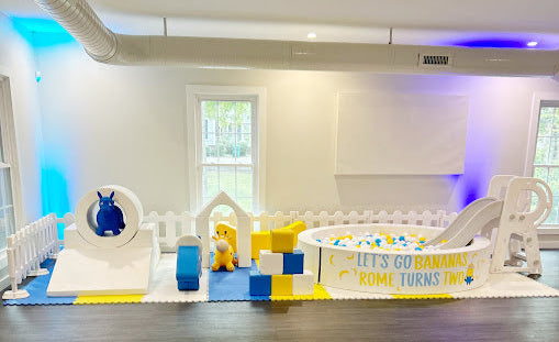 Our Canvas XL play area features an upgraded 7ft round ball pit to accommodate more little ones or older children up to age 8. It rents for up to four hours. Additional hours can be purchased for $50. Slide and custom vinyl decal are add-ons. They are available for an additional fee.