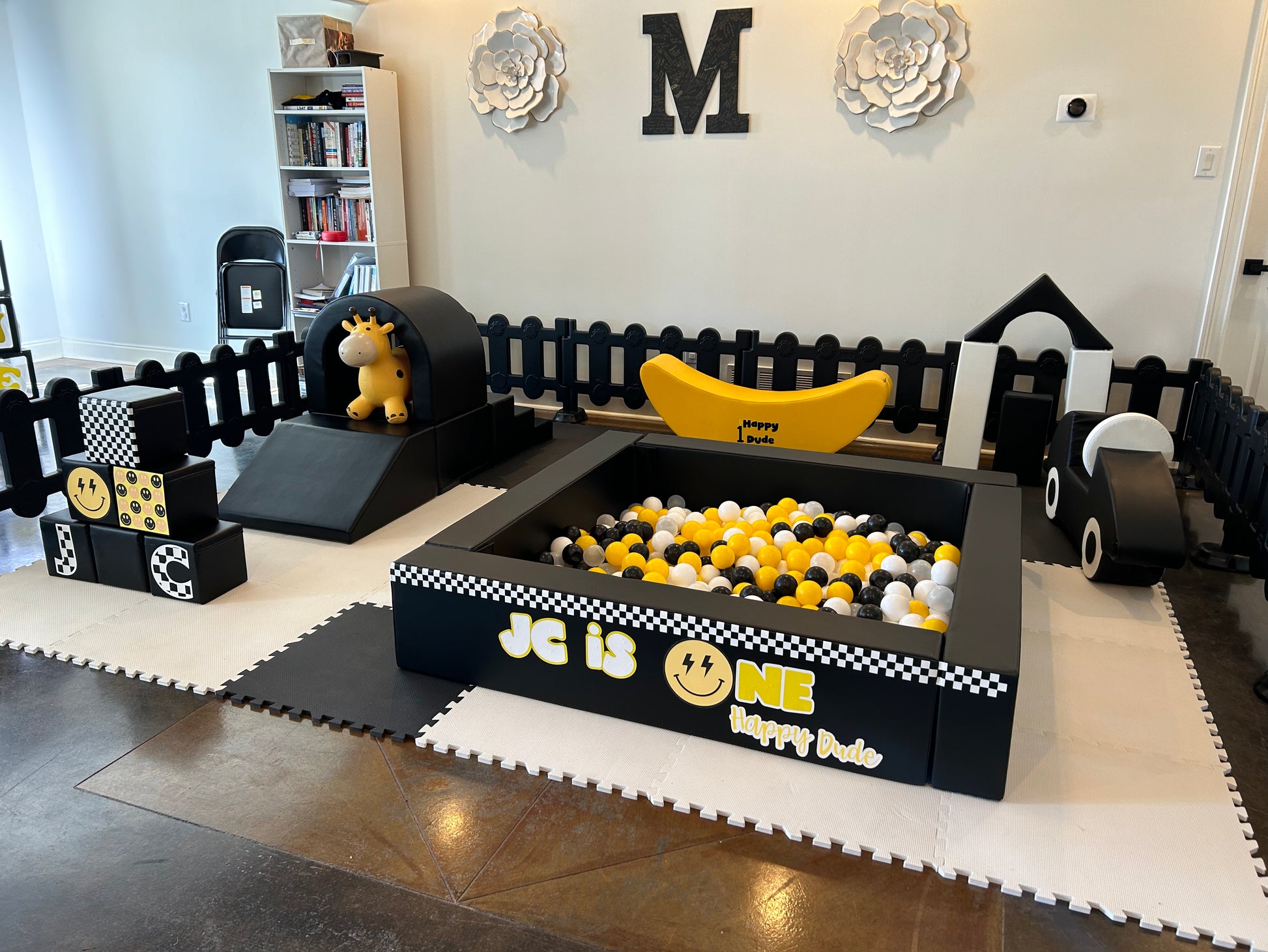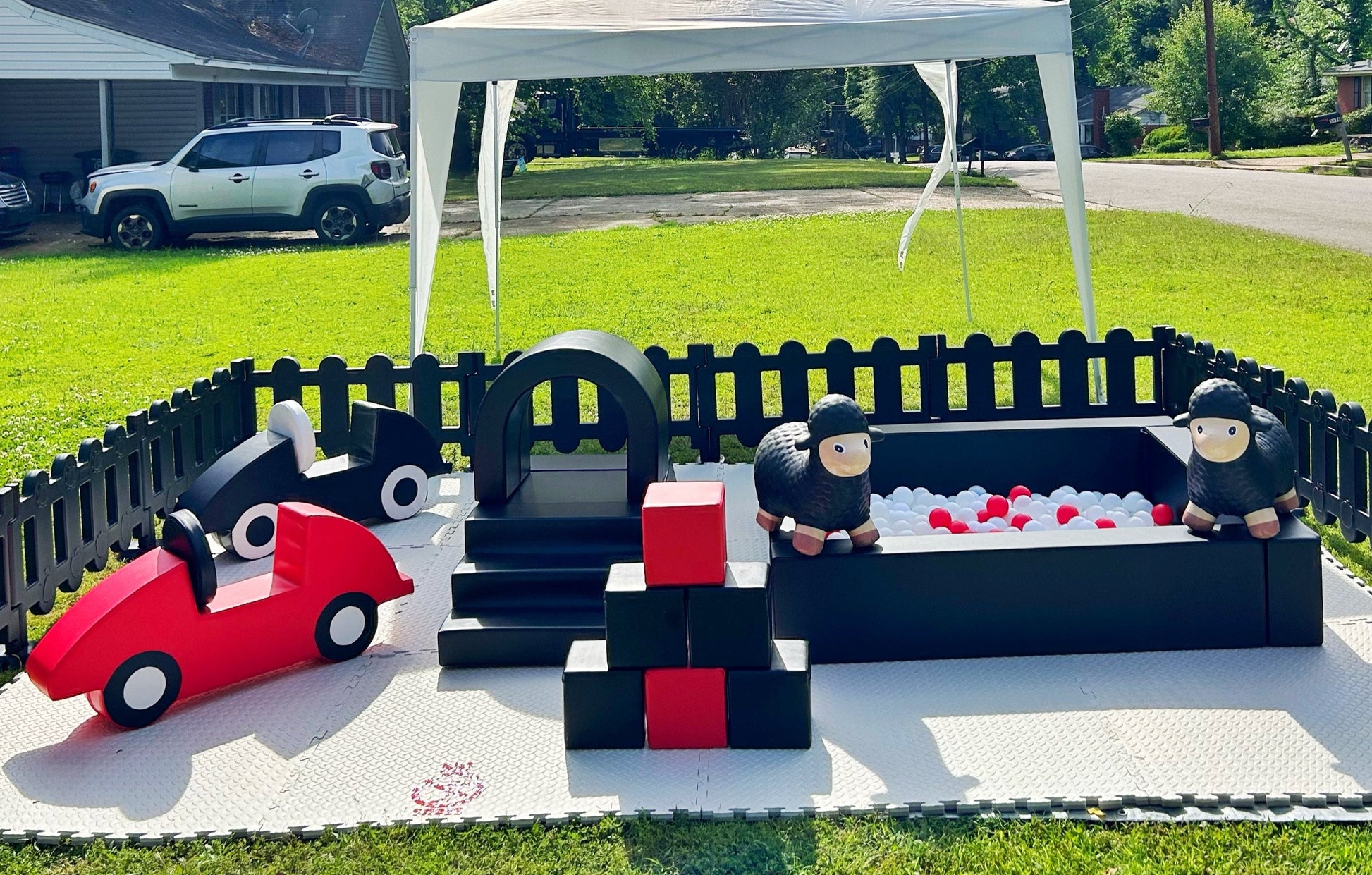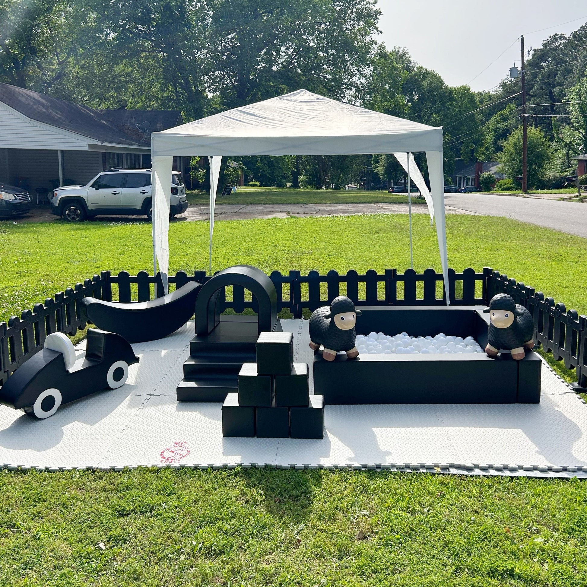 Black or White fences, foam floor mats, 5x5 black ball pit, climb and slide set, large building blocks, cube blocks, 2 bouncy hoppers and