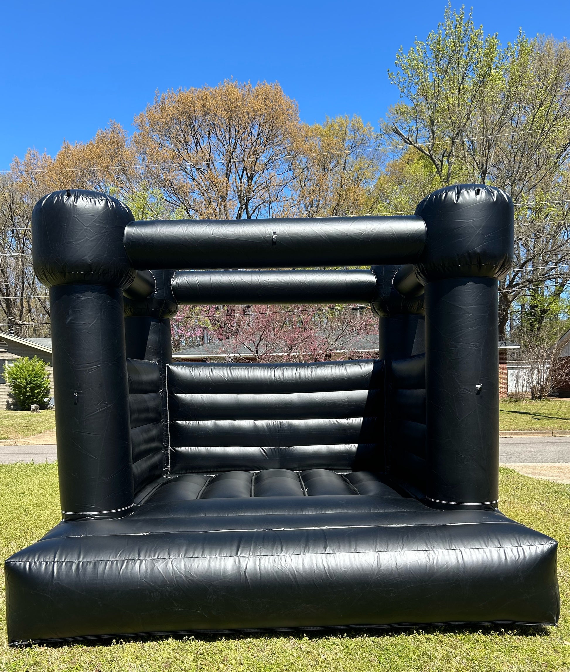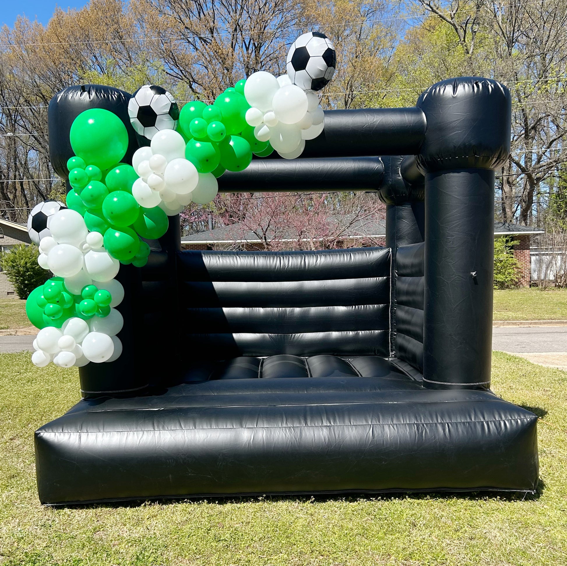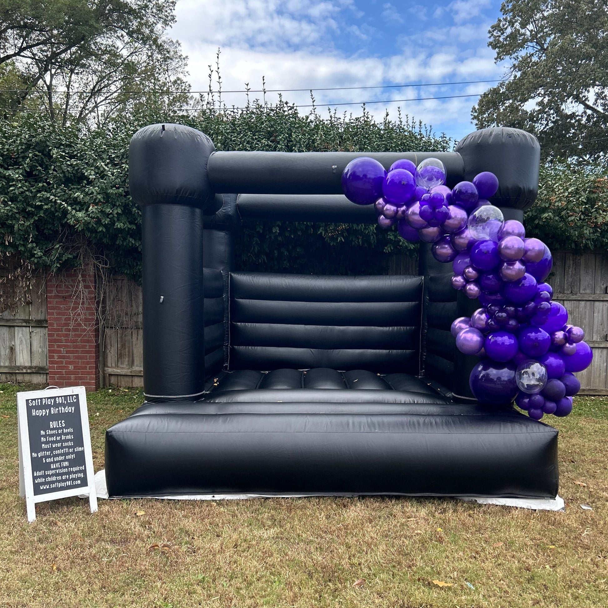 Our Midnight bounce house is 10ft x 10ft and is suitable for ages 2-10. It rents for up to four hours but additional hours can be purchased for $50. Balloon services and custom vinyl decals can be added for an additional fee.