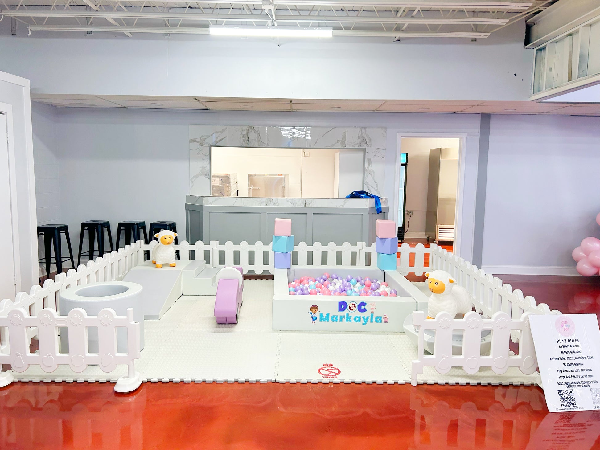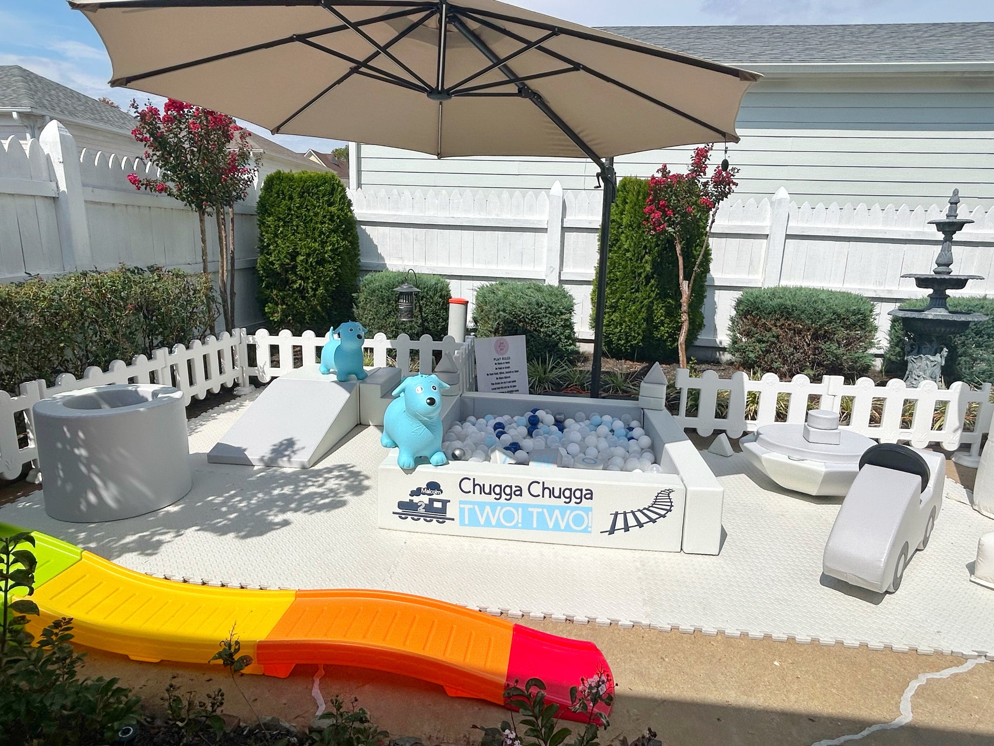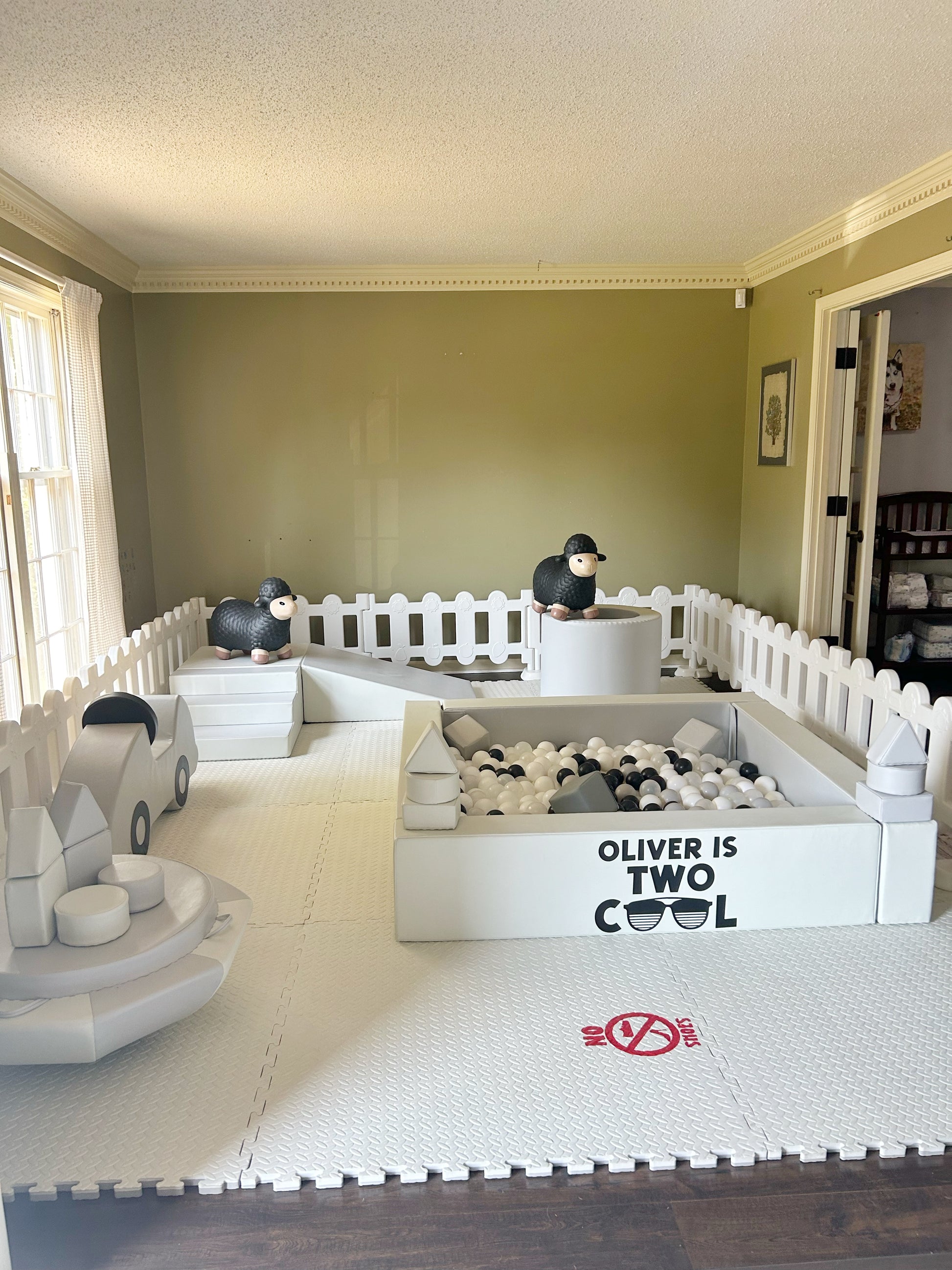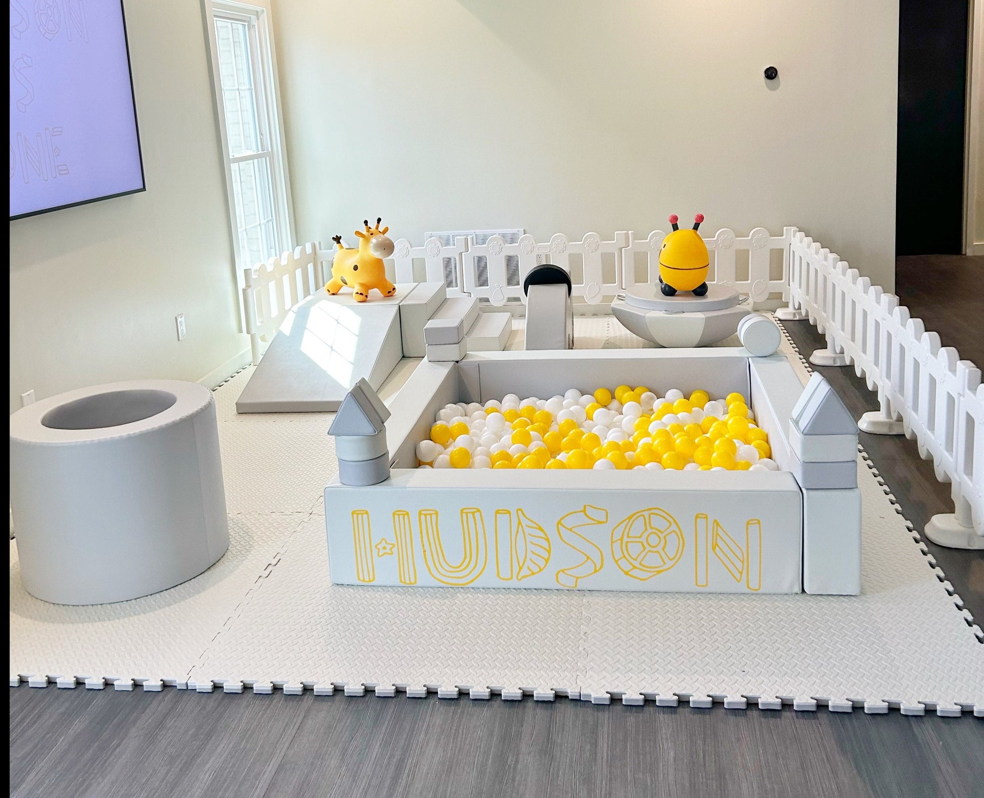 White fences, foam floor mats, 5ft x 5ft ball pit, large climb and slide set, large tumbler, mini blocks, 2 bouncy hoppers, and